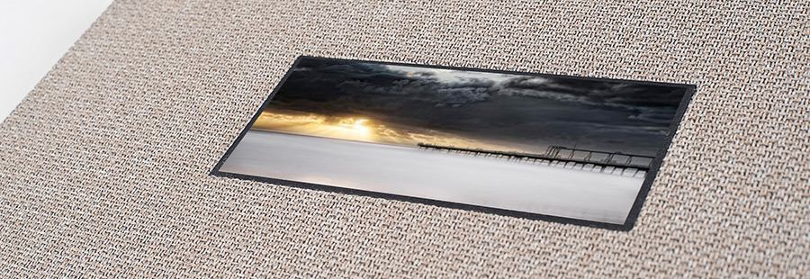 A Photo Device is a square or rectangle cut-out indented on the front cover to display a small photo or text. Recommended positions on the cover include top centre or bottom right. This popular, personalized option is aesthetically appealing on an otherwise plain album cover.